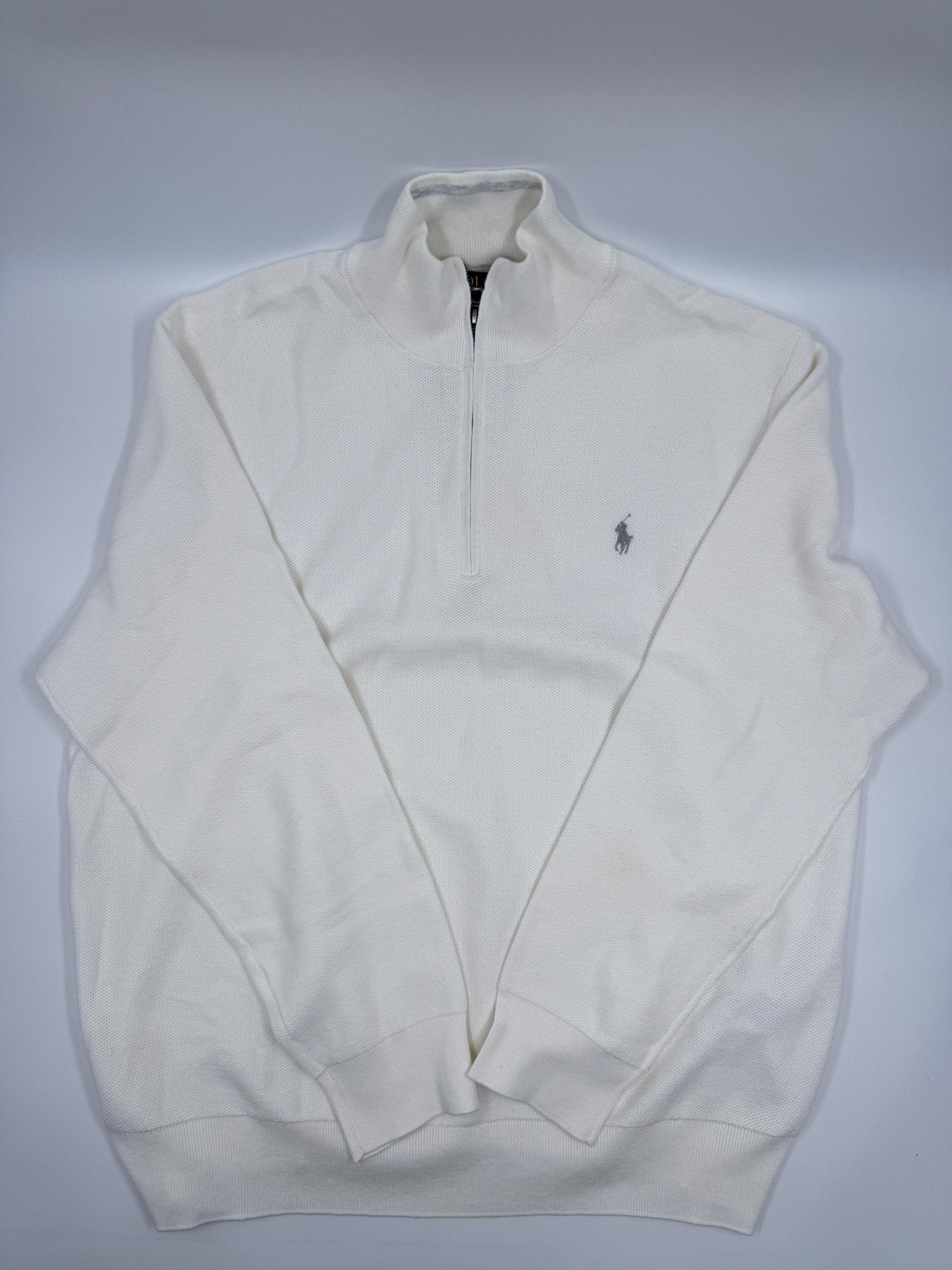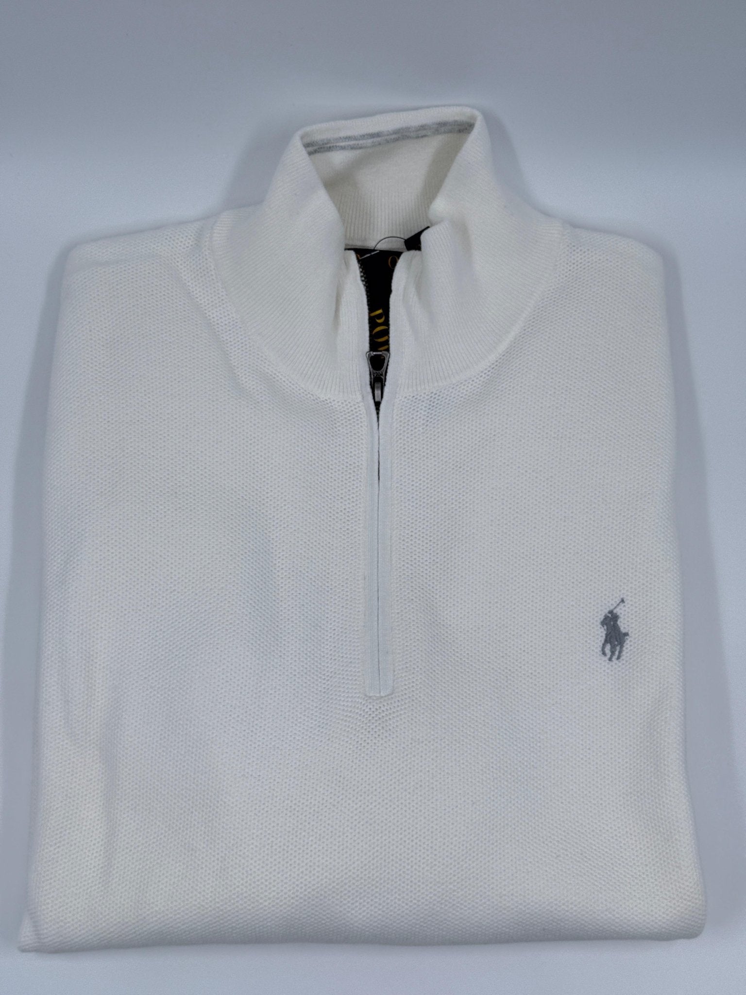 Ralph Lauren Herren Strick Half Zip Pullover in Weiß. Der Pullover von Polo Ralph Lauren in strahlendem Weiß ist ein zeitloses Basic für jeden Kleiderschrank und wurde aus hochwertiger Baumwolle gefertigt, die ein angenehmes Tragegefühl und eine hervorragende Haltbarkeit bietet. Es handelt sich um originale Markenware aus Überbeständen zu attraktivem Preis.