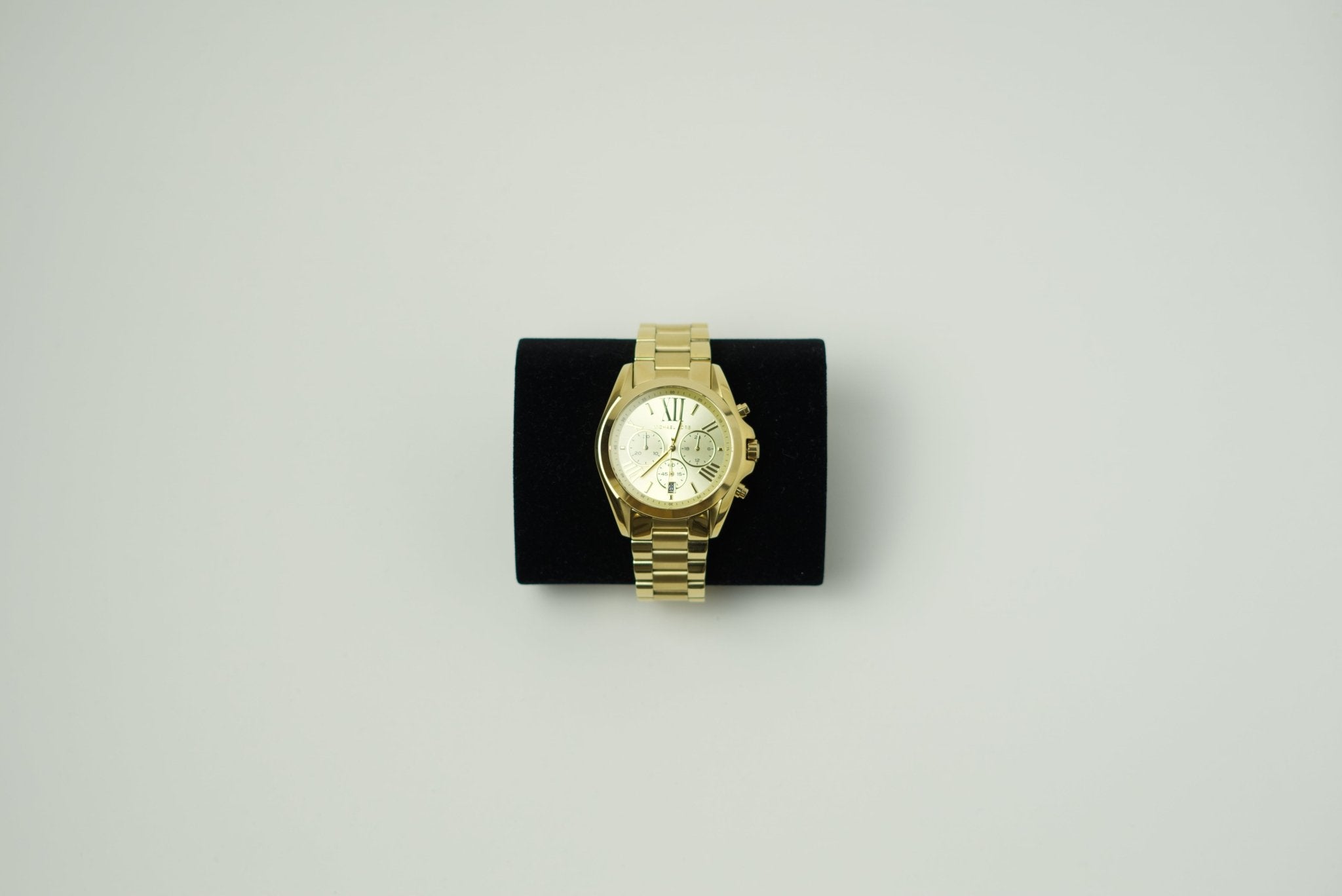 Michael Kors Chronograph Bradshaw – originale Markenware aus Überbeständen zu attraktivem Preis. Diese Damenuhr verfügt über ein goldfarbenes Edelstahlgehäuse und ein passendes Edelstahlarmband mit Faltschließe, ein champagnerfarbenes Zifferblatt mit römischen Zahlen sowie ein Quarz-Chronographenwerk.